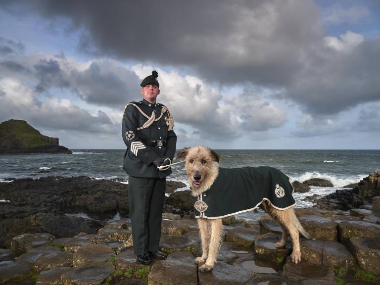 Read from the Belfast Newsletter on this day in 1915. It carried excerpts from a letter from Driver Fred Thomas, of Roden Street. Of his experiences of Christmas at the Front. Each man “was allowed three pints of beer. We had plum-pudding and plenty of tobacco…” There was also an account of the events at Limavady Railway Station when the party of the 10th (Service) Battalion Royal Inniskillings, which had been home on leave from Finner Camp, left to resume duty. The Whig reported on the arrival home to Bushmills the previous day of Robert Quigg VC on two weeks leave. Joseph McLaughlin of Limavady and the Royal Inniskilling Fusiliers died in 1917. Robert Gunn from Ligoniel was lost in HM Submarine P 48 in 1943. He was aged 18. One of the most criminal incidents occured this day in 1945 when Signalman David Millar from Stewartstown was executed whilst being a Japanese prisoner of war. He had been taken captive in Singapore in 1942. Photo – Wolfhound Major Robert Moore, with wolfhound Brian Boru X, the mascot of the Royal Irish Regiment, pictured on the Giant’s Causeway. Get today’s report here –