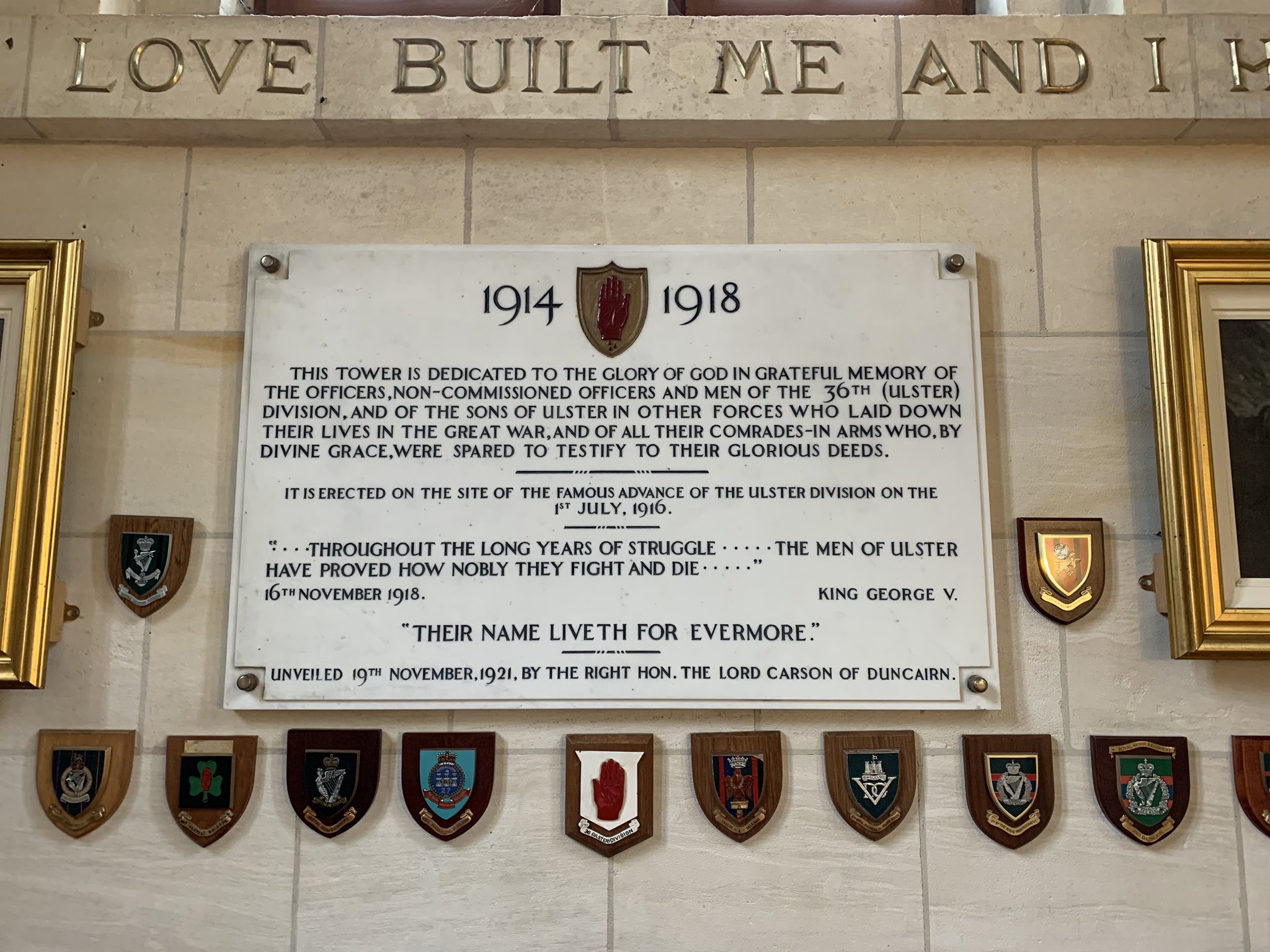 There are ten members of the Royal Irish Rifles remembered in today’s Roll of Honour. On the night of the 19th & 20th October 1918, the Ulster Division crossed the Lys River. This would be the last movement of the division before the war ended. Today’s Roll of 44 men includes William Anderson, a young scout-master from Greenisland who joined the NI Horse and later died in battle along with eight from the Royal Irish Rifles in WW1. Joseph Bamford from Kilrea served with Commander Locker-Lampson’s Naval Armoured Car Squadron before transferring to the Royal Flying Corps (RFC). He gained his ‘wings’ in August 1915 and was sent to Greece where he was decorated by France for his service. He was shot down behind German lines this day in 1917. In WW2 Maurice Green, a former member of 502 (Ulster) Squadron, RAFVR, died over Norway, having been in action during the Battle of Britain. He was educated at the Royal Belfast Academical Institution before going on to Trinity College Dublin as a Divinity student. Photo – In the Ulster Tower at Theipval.