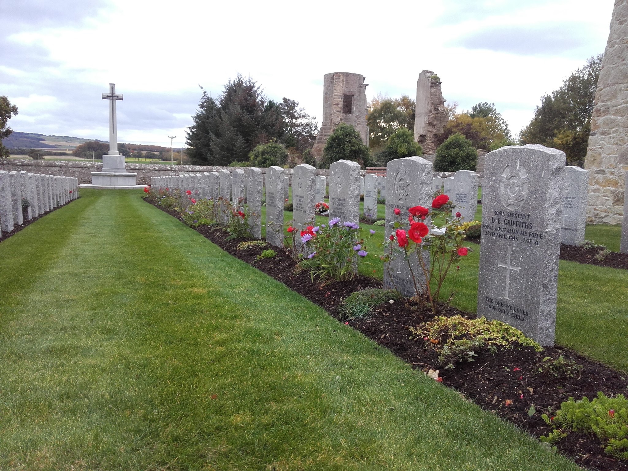 Featured in today’s Veterans RH is one of the most famous naval surgeons of his time. Surgeon Rear-Admiral, David Hewitt from Dungannon entered the Royal Navy in November 1897. He became Assistant to the Medical Director-General, in which post he served for six years, including the war of 1914-18. The Battle of La Bassée impacts on the Roll of Honour. By 22/10/1914, the 2nd Btn.Royal Irish Rifles had been at the front in France for 70 days. In that time, they had suffered 94 fatalities. In the following five days they were to lose nearly exactly double that figure – 186, in the vicinity of a northern French village which was to become the scene of a vicious set piece battle in the spring of 1915 – Neuve Chapelle. Belfast society is reflected in two entries from 1914. Patrick Bannon was from a mill-working family in the lower Falls area. Argentina-born Vivian Trevor Tighe Rea was educated at Campbell College, QUB and TCD where he was preparing for ordination. Both died serving in the Royal Irish Rifles.Today’s Roll contains records of 14 Royal Irish Rifles who died in WW1, two infanteers who died in WW2 liberating Ghent in Belgium, and two remembered on the Alamein Memorial in Egypt. Photo – CWGC cemetery in Kinross Abbey, Moray