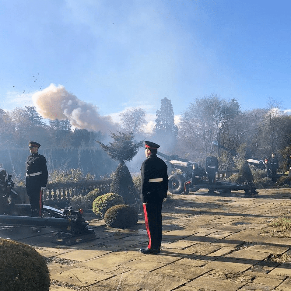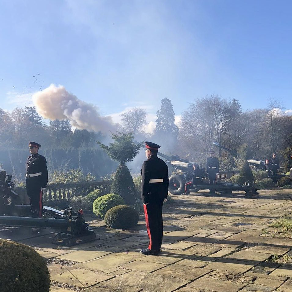 Today’s Roll includes three Royal Irish Riflemen. Hamilton Orr had served 12 years – 10 of them in India. He was given two days leave from England to visit Newtownards. He was killed within 10 days of reaching the front in November 1914. Two WW2 Fleet Air Arm pilots, one of whom had been a member of 502 (Ulster) Sqdn, RAF are recalled. The two veterans remembered today both have Canadian links. Benjamin Johnston, an Old Portoran, served in the Boer War and emigrated to Canada. He returned to serve with the N I Horse in WW1. Joseph Cunningham was a naval surgeon from Portrush who served on Atlantic and North Russian convoys in WW2. He migrated to Canada and was the first person from Canada to single-handedly sail the Atlantic in both directions. Photo – Ulster Gunners firing a Royal Salute at Hillsborough.
